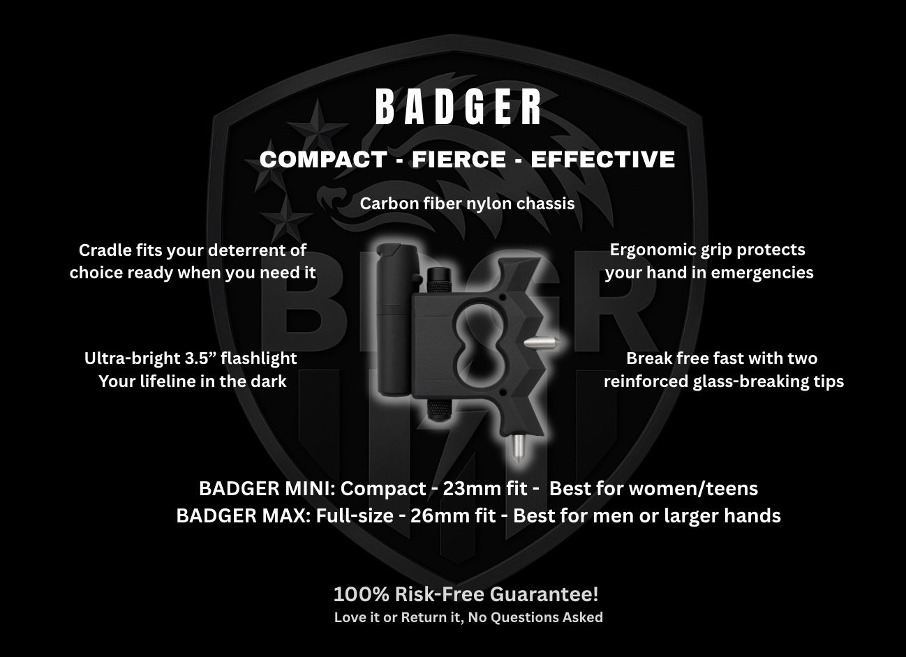 The BADGER isn’t just a tool — it’s peace of mind in your pocket. Engineered from carbon-fiber nylon, built with dual glass breakers and a powerful flashlight, it’s your edge in the unexpected. Whether you’re driving, walking, or protecting your family — the BADGER is the difference between being caught off guard and being in control.